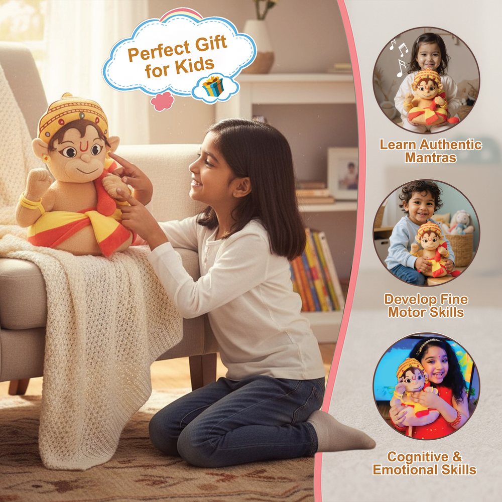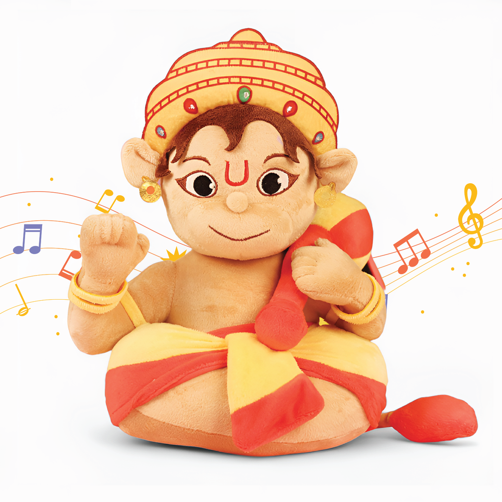 Introduce your little ones to Lord Hanuman, the divine embodiment of strength and devotion, with our Baby Hanuman soft toy. This mantra chanting plush toy chants 3 authentic mantras, introducing little ones to mindfulness, cultural wisdom, and joyful play. It's perfect for bedtime, playtime, and early spiritual bonding.