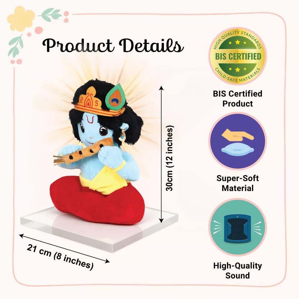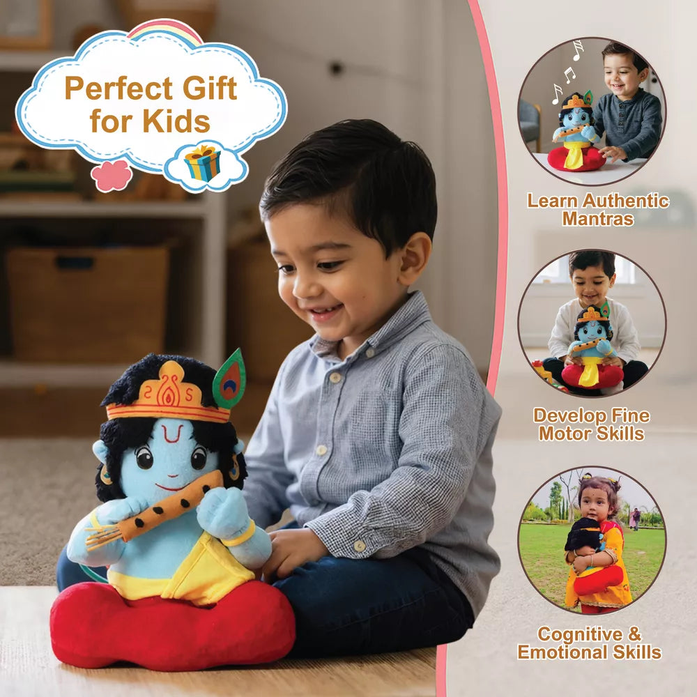 Introduce your little ones to Lord Krishna, the divine embodiment of joyful wisdom and divine playfulness, with our Baby Krishna soft toy. This mantra chanting plush toy chants 3 authentic mantras, introducing little ones to mindfulness, cultural wisdom, and joyful play. It's perfect for bedtime, playtime, and early spiritual bonding.